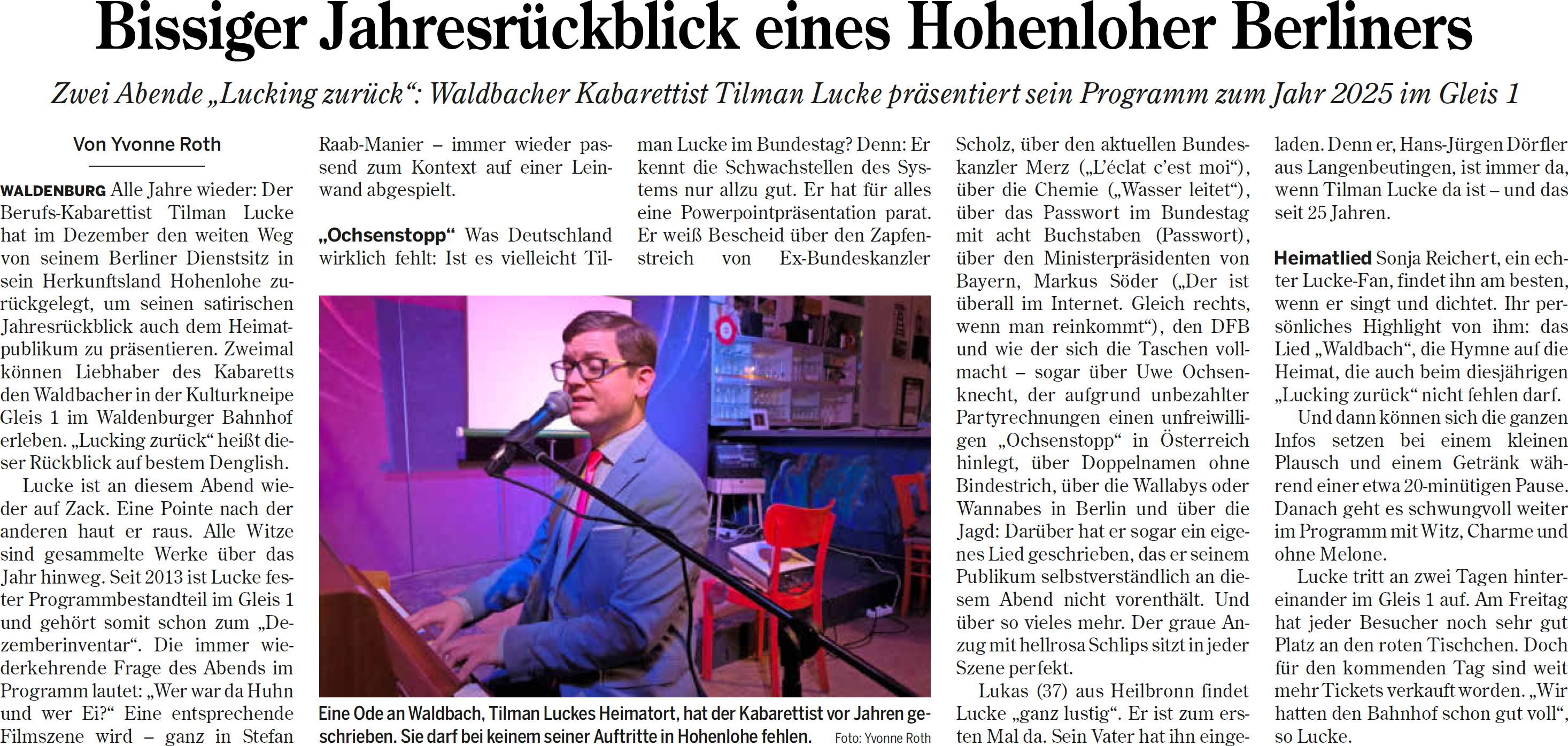 "Gemeinsam verbündet gegen ein verrücktes Jahr" (Hohenloher Zeitung, 17. Dezember 2024) "Immer schön den Finger in die Wunde legen" (Hohenloher Zeitung, 18. April 2024) "Rasanter Ritt durch ein beklopptes Jahr" (Hohenloher Zeitung, 19. Dezember 2023) "Geschichtspodcast, diesmal aus der Goethestadt" (Freies Wort, 6. November 2023) "Tilman Lucke gewinnt Rösrather Kabarettfestival" (Bergisches Handelsblatt, 13. Oktober 2023) "Zeitkritisches trifft Klamauk" (Kölner Stadtanzeiger, 30. September 2023) "Buchstabensuppe mit Gender-Sternchen" (Reutlinger General-Anzeiger, 10. Juni 2023) "Regionale Leckerbissen serviert" (Fränkische Nachrichten, 17. Mai 2023) "Ein Stück Berlin in Bretzfeld" (Hohenloher Zeitung, 6. September 2022) "Manchmal muss der Igel sterben" (Hohenloher Zeitung, 1. September 2022) "Zum Abschluss gibts die Entlaschungsurkunde" (Hohenloher Zeitung, 22. Dezember 2021) "Mit spitzer Zunge" (Echo am Mittwoch, 27. Oktober 2021) "Ohne Schweiß keine Lacher" (Hohenloher Zeitung, 22. Oktober 2021) "Ein-, zweimal hab' ich ein Buh geerntet" (Märkische Allgemeine Zeitung, 25. August 2020) "Die Kunst ist zurück im KleinKunstWerk" (Märkische Oder-Zeitung, 17. 6. 2020) "Sie ist die Schwänzing Queen..." (Lausitzer Rundschau, 20. 1. 2020) "Markige Verse vom Musterknaben" (Hohenloher Zeitung, 17. 12. 2019) "Weiterbildung für die Kleinkunst" (Saale-Zeitung, 19. 8. 2019) "Ein schwieriger Name: Ludger" (Westdeutsche Allgemeine Zeitung, 22. März 2019) "Schwarz sehen - weiß nicht" (Lausitzer Rundschau, 21. Januar 2019) "Lieder - hochpolitisch und grandios ehrlich" (Lausitzer Rundschau, 26. November 2018) "Hoyschrecken schwimmen nach Erlangen und Berlin" (Sächsische Zetung, 26. November 2018) "Mit dem Berliner Tilman Lucke politisch einmal um die Welt" (Magdeburger Volksstimme, 23. Juli 2018) "Der Wadenbeißer mit giftiger Zunge" (Südwest-Presse, Februar 2018) "Buntes Sommerfest für Demokratie" (Hohenloher Zeitung, 18. September 2017) "Schreibworkshop: Humor muss man einfach haben" (Magdeburger Volksstimme, 19. Juli 2017) "Letzte Sozis, neue Flughafenplaner, müde Fernfahrer" (Heilbronner Stimme, 27. März 2017) "Die Zukunft wird ein Krisenspaß" (Lausitzer Rundschau, 23. Januar 2017) "Kein Respekt vor nichts und niemandem" (Fuldaer Zeitung, 16. September 2016) "Das Mittelmeer für den Friedensnobelpreis vorgeschlagen" (Lausitzer Rundschau, 25. Januar 2016) "Mit Charme, Wortwitz und Biss" (Heilbronner Stimme, 1. Dezember 2015) "Von Satire-Pausen halte ich nichts" (Magdeburger Biber, 2. April 2015) "Abschiede und Jubiläen" (Hohenloher Zeitung, 23. Dezember 2014) "Rote Nasen auch ohne Clowns" (Die Rheinpfalz, 17. Juli 2014) "Alternativlos mit 'Navi' Merkel zum Crash" (Lausitzer Rundschau, 20. Januar 2014) "19. Kabarett-Treffen in Cottbus eröffnet" (Lausitzer Rundschau, 17. Januar 2014) "Gesungene Röntgenbilder der Seele" (Cannstatter Zeitung, 21. Oktober 2013) "Pointen kann man lernen" (Augsburger Allgemeine, 25. Mai 2013) "Humor macht viel Arbeit" (Saale-Zeitung, 21. August 2012) "Babys, Kuhfladen und Dorfleben" (Hohenloher Zeitung, 24. Mai 2012) "Mit Lucke gegen Lücke" (Ludwigsburger Kreiszeitung, 5. März 2012) "Kabarettpreis geht nach Franken" (Hessisch-Niedersächsische Allgemeine, 14. November 2011) "Wadenbeißer mit Giftzahn" (Hessisch-Niedersächsische Allgemeine, 4. November 2011) "Die Sternennacht des schwarzen Humors" (Dresdner Akzente, 19. Mai 2011) "Auf gutem Weg zum kabarettistischen Olymp" (Schwarzwälder Bote, 27. November 2010) "Feingefühl für Idiotien" (Burger Spiegel, 17. Februar 2010) "Lästermaul und Engelszunge" (Heilbronner Stimme, 2. Oktober 2008) "Die Neuen machen Furore" (Lausitzer Rundschau, 21. Januar 2008)